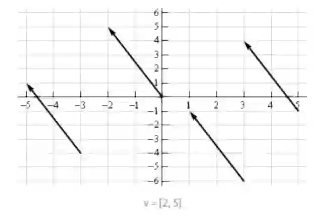 向量一般表征着一个点的运动,一个向量同时储存其潜在变化的方向和大小。如下图所示,在平面空间中画出了向量 [-2,5],因为向量只储存了方向和大小,那么平移并不会改变向量的值,所以所有平移的向量(方向和大小不变)都是相等的。
