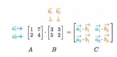 A 矩阵行向量 a1 与 B 矩阵列向量 b1 的点积,即下图所示:
