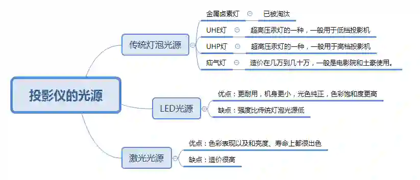 投影仪的光源一般是灯泡、LED 以及激光这三种,灯泡机型寿命较短,重量也相对更重些,但是价格低、同价位下的亮度普遍要比其他光源高一档。所以如果预算有限也使用频率不那么高,可以考虑买灯泡光源的,用使用寿命换亮度。