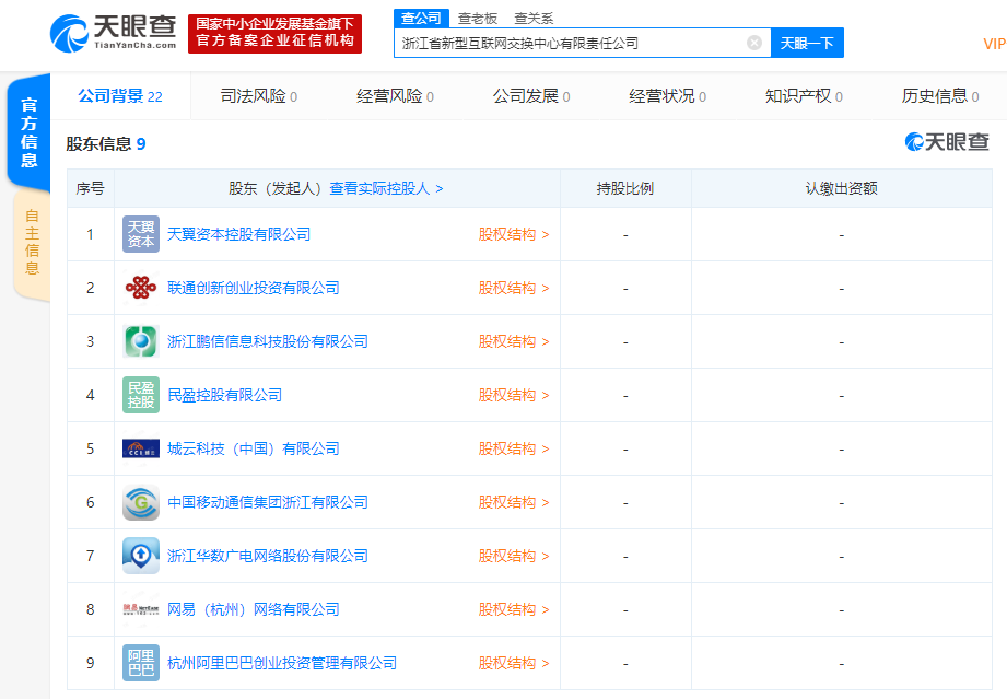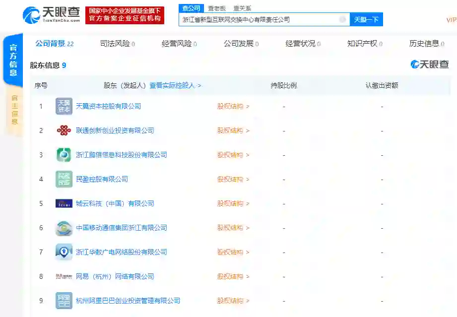 天眼查数据显示,6月28日,浙江省新型互联网交换中心有限责任公司成立。该公司注册资本1亿元,法定代表人是王顶,公司经营范围包括数据处理服务等。该公司共有9大股东,其中,网易(杭州)网络有限公司,联通创新创业投资有限公司、中国移动通信集团浙江有限公司、杭州阿里巴巴创业投资管理有限公司等均在列。(36kr)