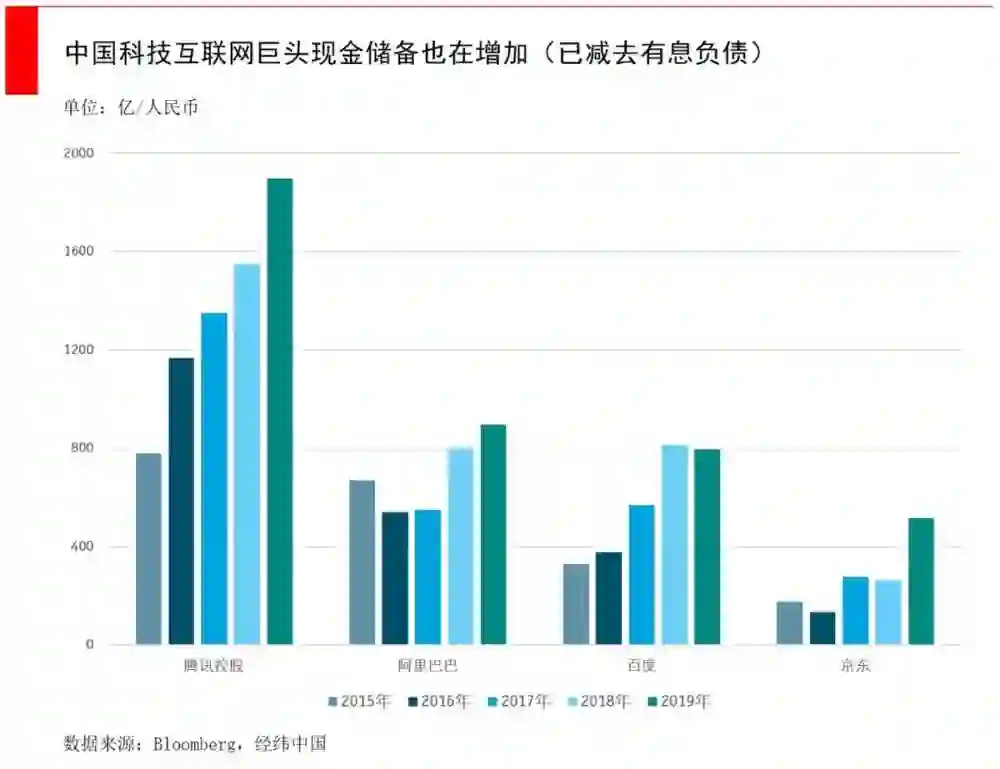 中国的科技巨头也大体符合这一趋势,只不过与FAAMG相比规模还比较小,腾讯、阿里、百度和京东在2019年总共囤积了6064亿人民币现金及等价物(866亿美元)。BATJ们正处于囤积现金的上升期,这些储备足以面对危机。