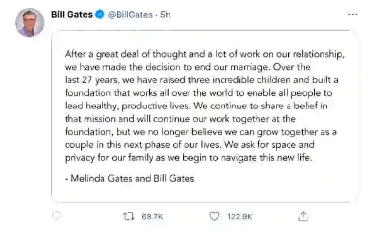 「我将永远为我给梅琳达和我们的家庭带来的痛苦感到抱歉。我钦佩梅琳达和她为改善全世界女性的生活所做的一切,我对我们继续在我们的基金会一起做的工作表示感谢。」