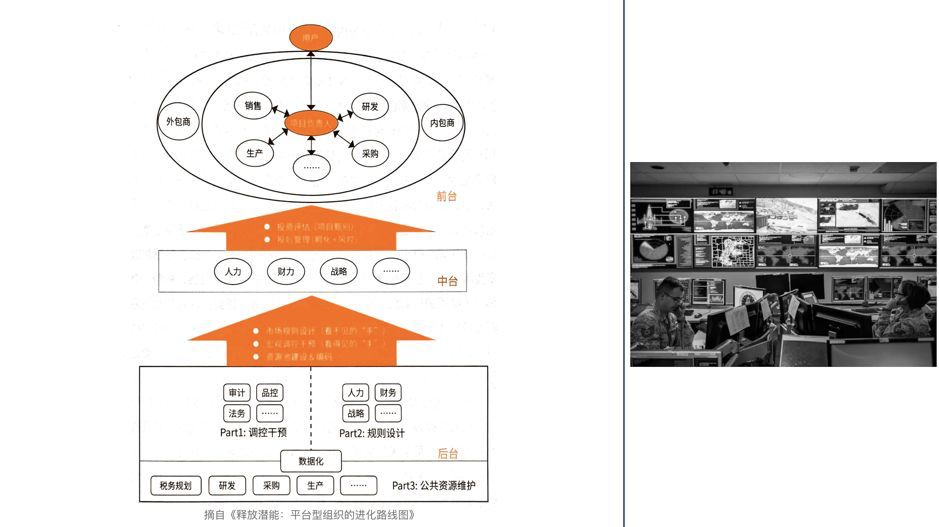 为了真正解决企业创新在组织层面的摩擦和阻力,构建真正的平台型组织。《释放潜能-平台型组织的进化路线图》提出了上图这样一个平台型组织的组织结构。