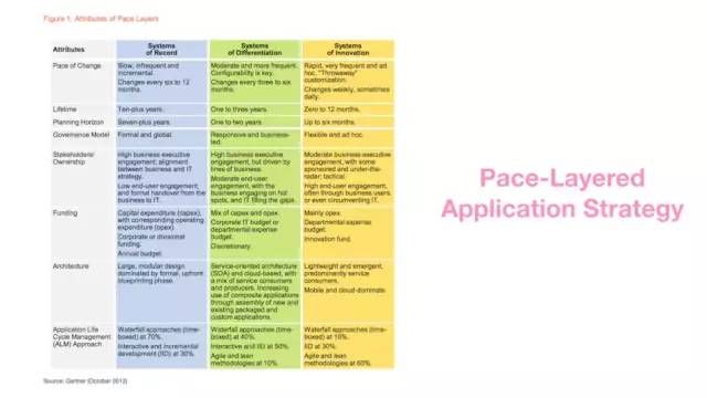 对于这样的问题,Gatner在2016年提出的一份《Pace-Layered Application Strategy》报告中,给出了一种解决方案,即按照“步速”将企业的应用系统划分为三个层次(正好契合前中后台的三个层次),不同的层次采用完全不同的策略。