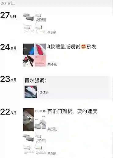 张力(化名)就是一名专门做IQOS电子烟批发的卖家,每天在朋友圈上更新若干条产品内容。当第一财经1℃记者询问他是否有IQOS电子烟卖的时候,他即刻就发来了一张IQOS电子烟的价格清单。