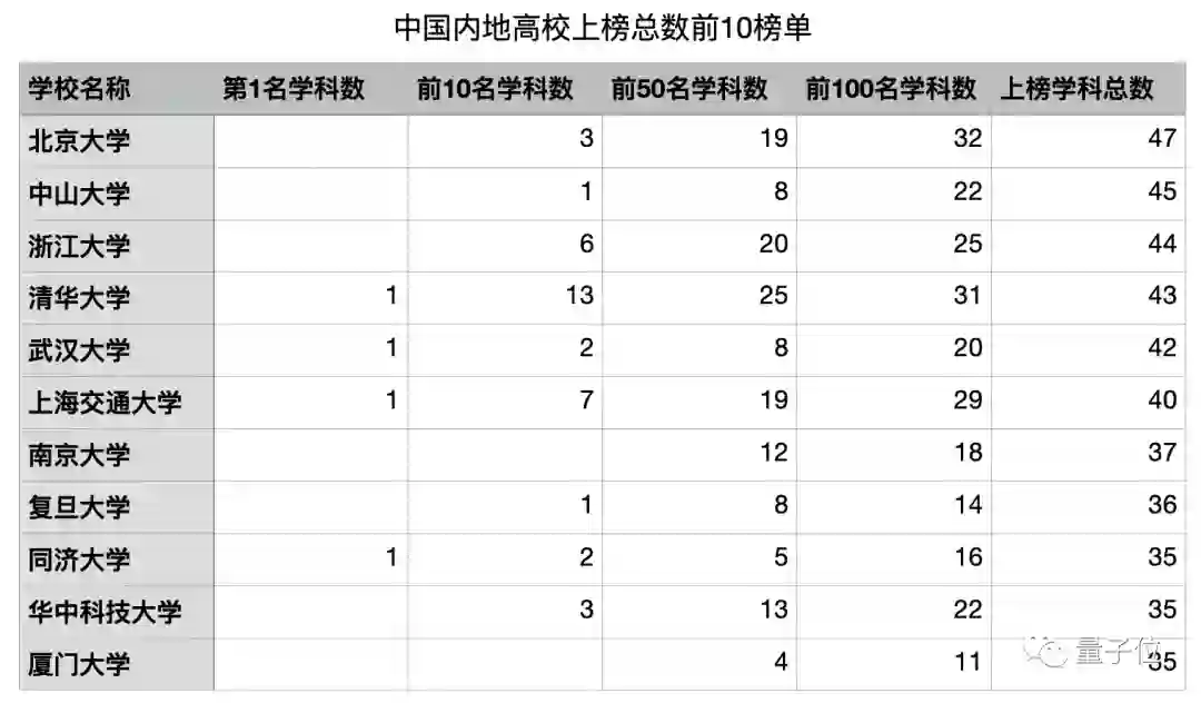 而回到国内上榜数量上看,此次北京大学最多,共有47个学科上榜,比去年多出3个学科,而前100名学科数为32,也是位列全国第一。