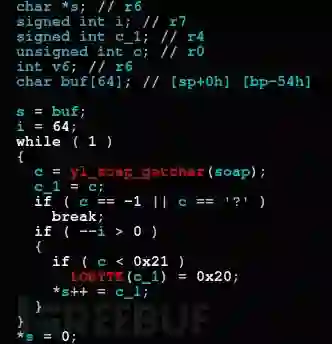 在开源代码分析中,我们发现其中使用了gSOAP库,经分析确认,gSOAP库曾存在“魔鬼绿萝”(Devil’s Ivy)的CVE-2017-9765漏洞,是早前在监控摄像头开源软件中爆出的0-day漏洞,曾影响了全球大量IoT设备。以下为该漏洞代码段的反编译代码: