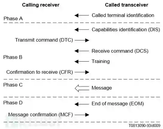 多功能一体机如果支持传真功能,那么也一定能支持涉及传真设备的ITU-T G3协议标准,该标准定义了传真发送端和接收端的基本功能,以及协议的不同实现阶段,如下图所示: