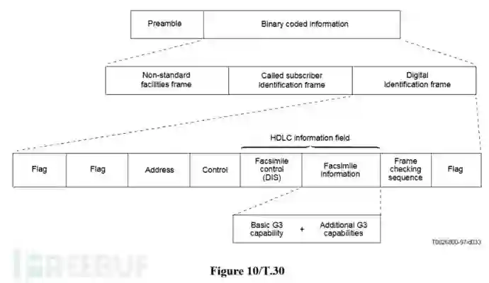 在Pahse B阶段,传真猫会进行功能交换,所以它可以找出能支持的最佳传输方式。为此,我们编写了一个简单脚本对这些使用ITU T.30标准的消息进行了语法分析,下图为对数字识别信号(DIS)的解析结果: