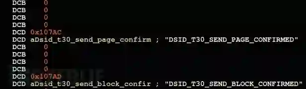 然而,当我们在分析T.30状态机任务(“tT30”)时,偶然发现了很多使用特别ID的追踪方法(trace),深入分析发现,这些ID也被用于一些以“DSID_”为前缀开头的字符串列表中。实际上,这些字符串看似是与那些使用ID的追踪方法(trace)逻辑相匹配,这也给了我们重要的逆向提示线索。于是乎,我们从所有不同的DSID列表中创建了一个枚举类型,形成了任务中的各种追踪方法文本描述。以下为trace追踪方法中使用的DSID值: