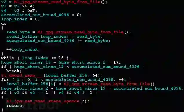 由于上一个漏洞的发现是标准实现中不应支持的标记所导致的,所以,我们继续把关注点扩展到了其它标记身上。在解码文件的数据帧时,DHT标记(Difine Huffman Table) 定义了一个特定的霍夫曼表来使用。而且,这个DHT标记漏洞涉及到的函数比上个漏洞函数还简单容易一些: