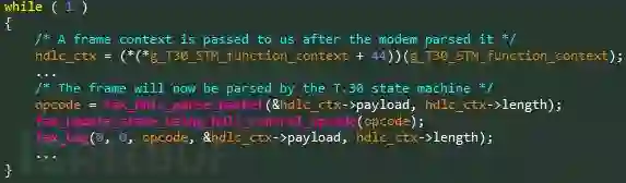 当我们逆向T.30状态机和之后处理HDLC的传真猫(“tFaxModem”)时,发现缺少了多个函数指针表。之后我们还发现,有两种常规的代码模式貌似和 allocation/deallocation路径有些相似。每个模块中采用的方法,是为了接收来自其它模块的消息,或者,也可能是把缓存发送到下一模块中,如下图使用某个功能表从另一个任务接收数据帧: