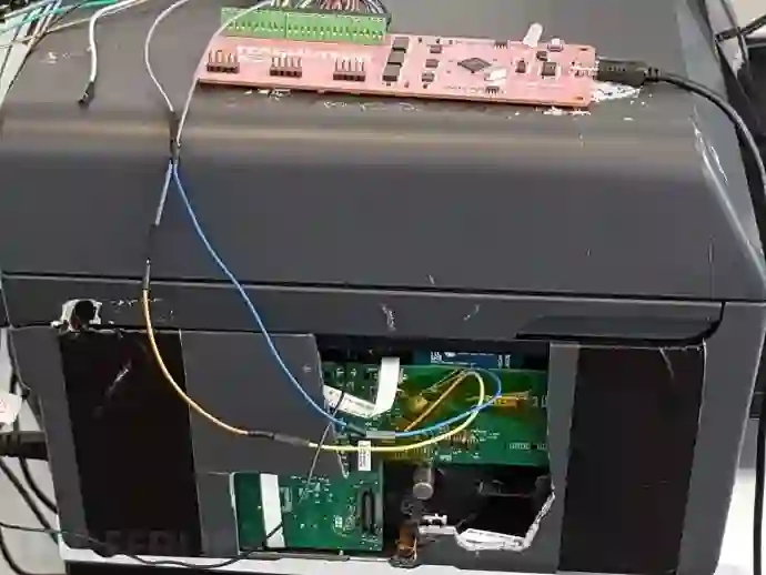 首先,我们分析了一体机的主板,想找到上面的串行调试端口,不一会,我们就有了发现。下图为连接JTAGULATOR到打印机的串行调试器: