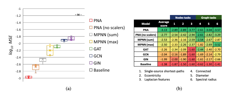 使用相同架构和各种接近最佳的超参数的不同GNN模型的多任务基准。图a中PNA模型始终优于最新模型,图b显示PNA的在所有任务表现的更好