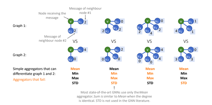 使用单个GNN层和连续输入要素空间,一些聚合器无法区分邻域消息。同时研究还发现聚合器是互补的,至少有一个聚合器始终可以区分不同的邻域消息。