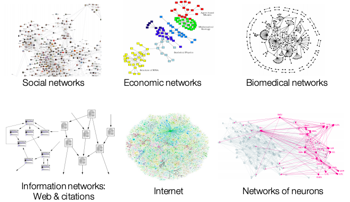 为什么我们要通过图来表示学习?是因为很多数据都是图结构,例如社交网络、经济网络、生物医学网络、信息网络、互联网、神经网络等。