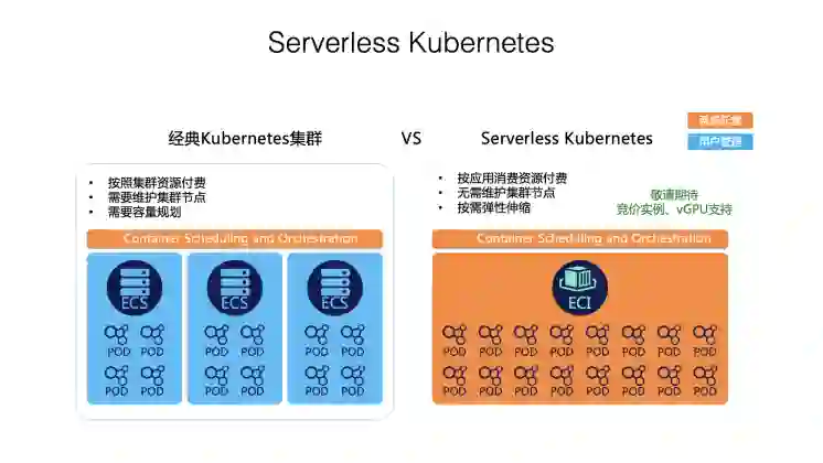 完全兼容现有 K8s 容器应用,但是所有容器基础设施被阿里云托管,用户可以专注于自己的应用。它具备几个特点: