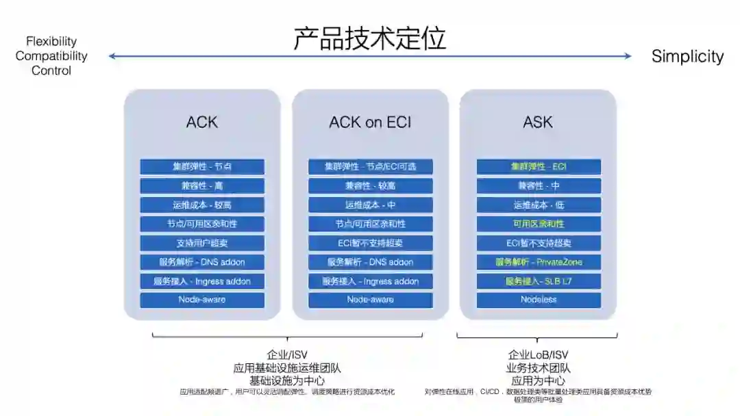 用户该如何选择 ACK 和 ASK 呢?ACK 主要面向的是基础设施运维团队,具备和 K8s 高度的兼容性和灵活性控制性。而 ASK 则是面向业务技术团队或者开发者,用户完全不需具备 K8s 的管理运维能力,即可管理和部署 K8s 应用。而 ACK on ECI,则同时支持用户负载运行在 ECS 实例或者 ECI 实例上,可以允许用户进行灵活控制。