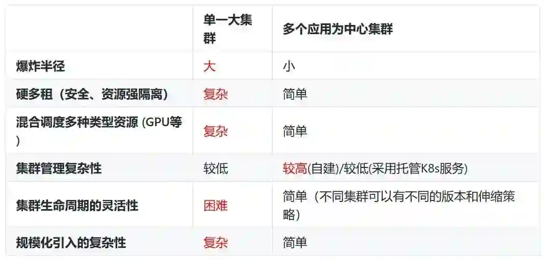 在用户反馈中,采用以多个小集群的主要原因在于爆炸半径比较小,可以有效提升系统的可用性。同时通过集群也可以比较好地进行资源隔离。管理、运维复杂性的增加是采用多个小集群的一个不足之处,但是在公共云上利用托管的 K8s 服务(比如阿里云的 ACK)创建和管理 K8s 集群生命周期非常简单,可以有效解决这个问题。