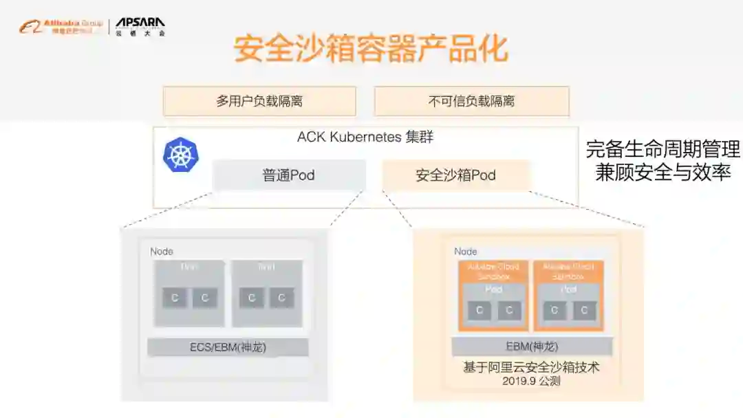 对于用户而言,如果需要多租户隔离的场景,可以采用安全沙箱配合 network policy 来完成,当然也可以让不同租户的应用运行在不同的虚拟机或者弹性容器实例上,利用虚拟化技术来进行隔离。