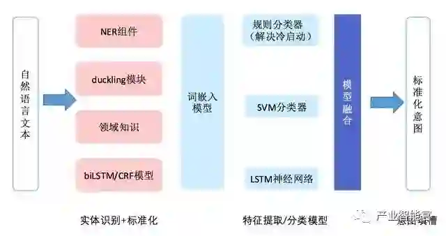 首先,小明接受用户输入的自然语言,通过 NER 组件、duckling 规则模型、领域词典、biLSTM/CRF 等模型识别通用实体及领域实体,并完成实体标准化。