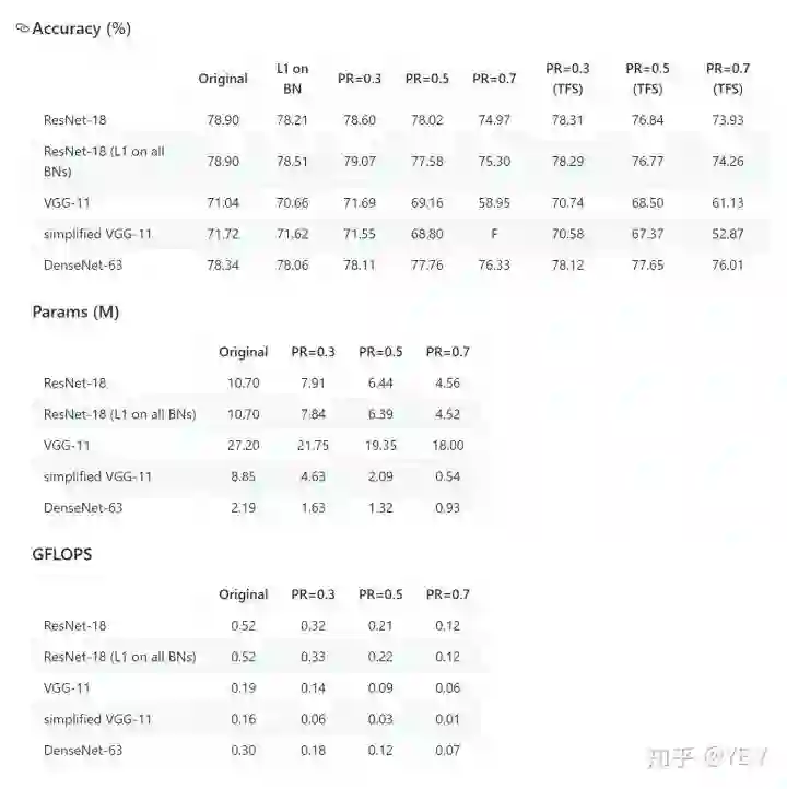 在CIFAR-100数据上,基于netslim用VGG-11、VGG-11简化版、ResNet-18和自己瞎改的一个DenseNet-63做了测试,结果如下: