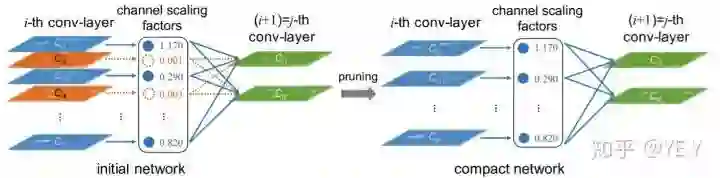 本文主要介绍的是围绕一篇基于magnitude的structured pruning的文章,发表在ICCV2017的《Learning Efficient Convolutional Networks Through Network Slimming》。从实用角度来看,这篇文章是我个人认为现有剪枝文章里最易于实现的一篇。文章的方法异常的简单,channel的贡献可以和Batchnorm层关联起来,如果channel后的batchnorm层中对应的scaling factor足够小,就说明该channel的贡献可以被忽略,如下图所示:
