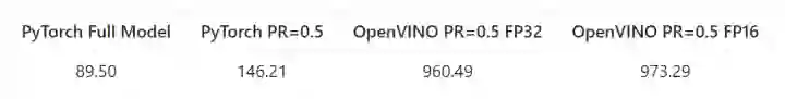 如果是在CPU上部署,或者是一些Intel的处理器/加速器支持的低功耗硬件上,剪枝后模型可以无差别地在OpenVINO中获得进一步加速,简化版VGG-11在Xeon 8160上的测试结果如下: