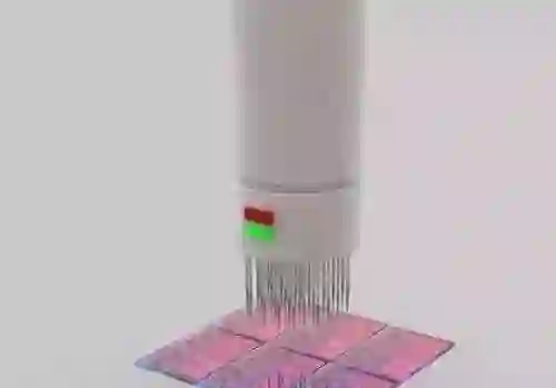 内核级别,大约10毫米/0.5英寸。图中是晶圆的局部,正在接受第一次功能性测试,使用参考电路图案和每一块芯片进行对比。