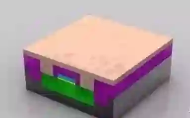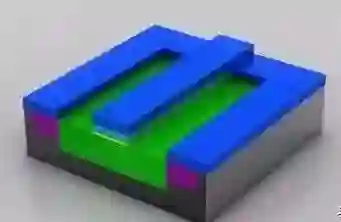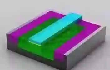 至此,晶体管已经基本完成。在绝缘材(品红色)上蚀刻出三个孔洞,并填充铜,以便和其它晶体管互连。