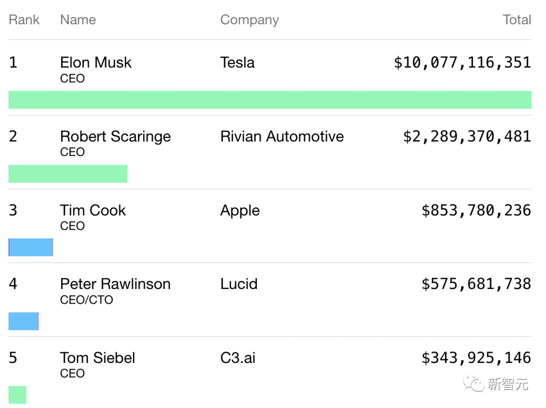 另外,排在第二的是电动皮卡公司Rivian的老板Robert Scaringe,近23亿美元。而苹果库克以8.53亿美元位居第三。