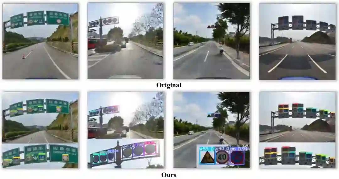 Shao等人提出了一种区域建议算法来简化Gabor小波,提高Faster R-CNN用于交通标志检测。Zhang等人提出了一种改进的基于YOLOv2的交通标志检测器,修改了经典YOLOv2网络的卷积层数,使其适合中国交通标志数据集。Li等人开发了一种新的感知生成对抗网络,该网络通过生成小交通标志的超分辨率表示来提高检测性能。SADANet结合域自适应网络和多尺度预测网络来解决尺度变化问题。