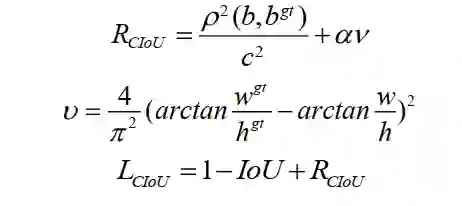 本文用Complete IoU(CIoU) Loss代替GIoU Loss。CIoU损失在考虑GIoU损失的基础上,考虑了BBox的重叠面积、中心点距离以及BBox长宽比的一致性。损失函数可以定义为: