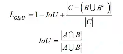 在预测中,使用Generalized IoU (GIoU) Loss作为BBox的损失函数,使用加权的非最大抑制(NMS)方法NMS。损失函数如下: