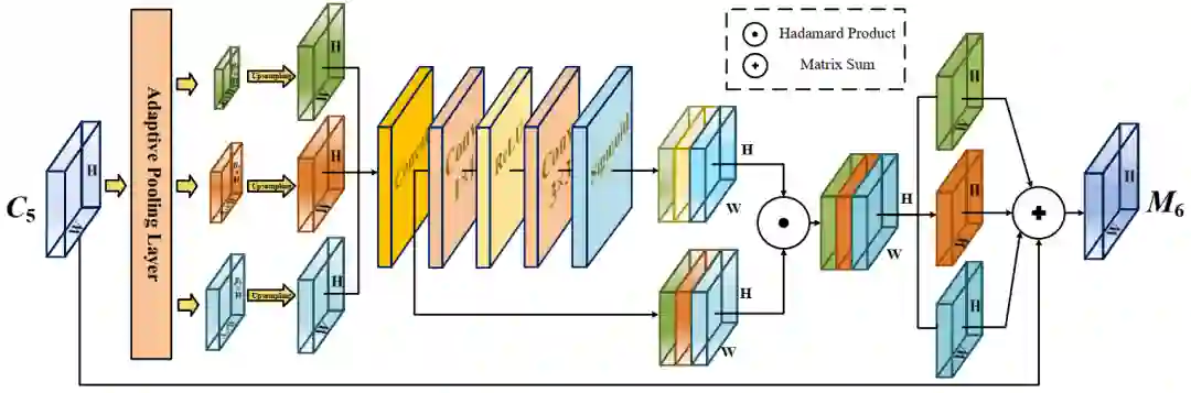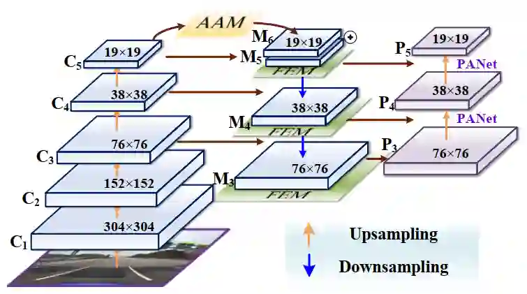 输入图像通过多个卷积生成特征映射{C1, C2, C3, C4, C5}。C5通过AAM生成特征映射M6。M6与M5求和并通过自上而下的途径传播与较低层次的其他特征融合,通过扩展感受域每次融合后的有限元分析。PANet缩短了底层与顶层特征之间的信息路径。