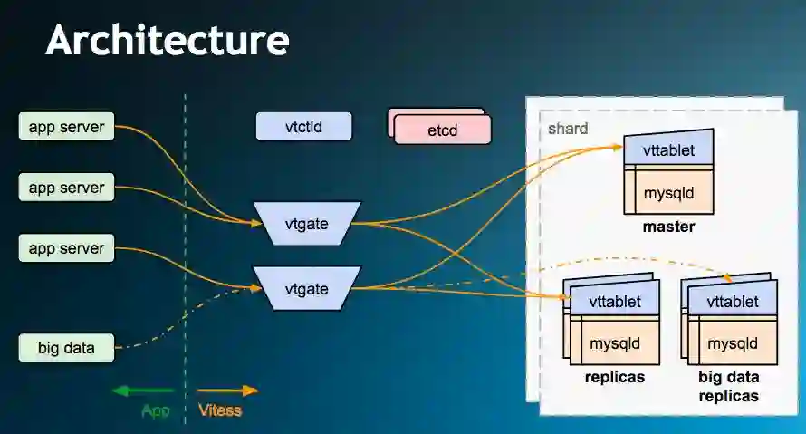 Vitess 的架构 使用 vtgate 提供负载均衡和查询路由。vtgate 是一种无状态层,可轻易地上下扩展。vtgate 将查询路由至为分片提供代理的 vtable,并返回聚合结果给 vtgates。