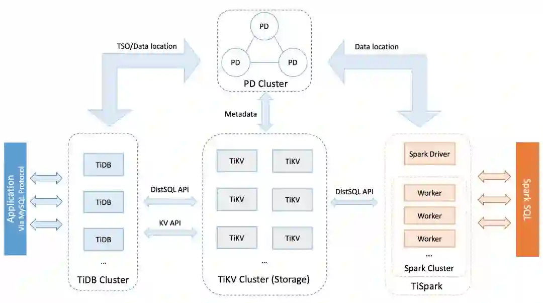 TiSpark 针对复杂 OLAP 查询做了一些优化。和 TiDB 层类似,TiSpark 也是一种无状态计算层,并与 TiKV 层交互。TiSpark 在设计上就是通过与 Spark SQL 的交互去处理复杂 OLAP 查询。因此,同时部署 TiDB 和 TiSpark 可消除 ETL 的代价,给出一种同时支持分析和事务需求的统一解决方案。