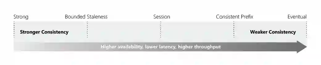 Cosmos DB 提供 多个一致性层级,支持开发人员在确定所需的适用 SLA 上做出权衡。除了两种极端的强一致性情况和最终一致性之外,Cosmos DB 还一并提供了另外五个良好定义的一致性层级。每个一致性层级提供单独的 SLA,确保达到特定的可用和性能层级。
