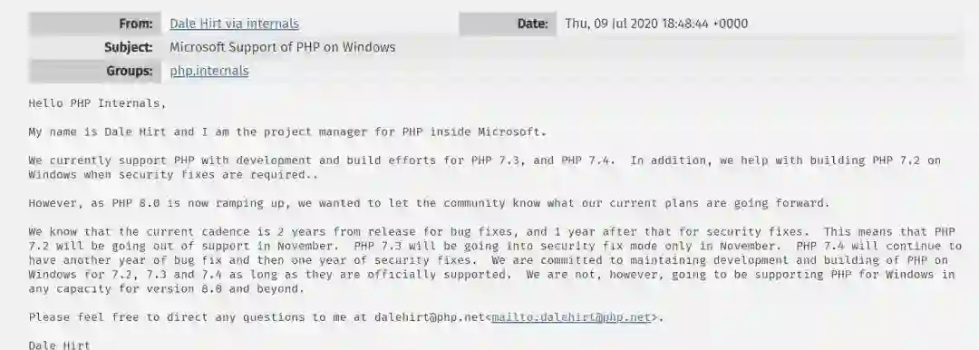 微软 PHP 项目经理 Dale Hirt 在 PHP 邮件列表中宣布,Windows 将不再支持 PHP v8 及更高版本。