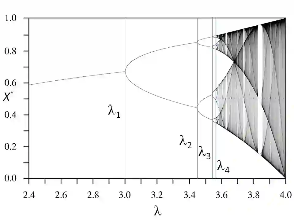 但我们确定的是,费根鲍姆常数与混沌理论有着密切的联系。费根鲍姆常数在抛物线映射中发现的倍周期分叉,其实是另一种“混沌”的前奏(数列是一种离散动力系统,离散动力系统中也存在混沌)。
