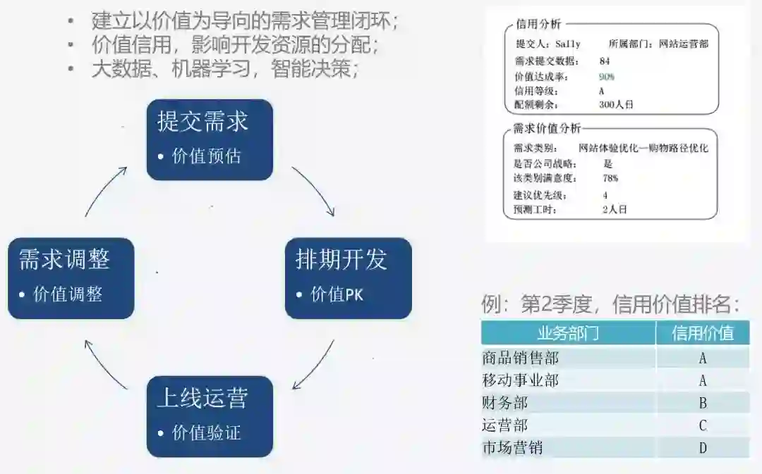 建立需求管理闭环。以价值为导向的需求治理机制,是在需求提报环节,提出该需求的价值预估,即这个需求将给业务带来什么样的价值,这些价值要能够量化、能够追踪。比如,一个结算系统需求,价值是:提升客户对账效率20%,上线后会来验证效果,看看是否达到预期。