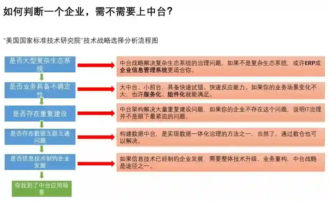 总之,企业是否要上中台,要根据企业的具体情况做分析,可根据上文“中台战略选择分析流程图”进行判断,不要盲目跟风,认为别人家上了中台,自己也要上。