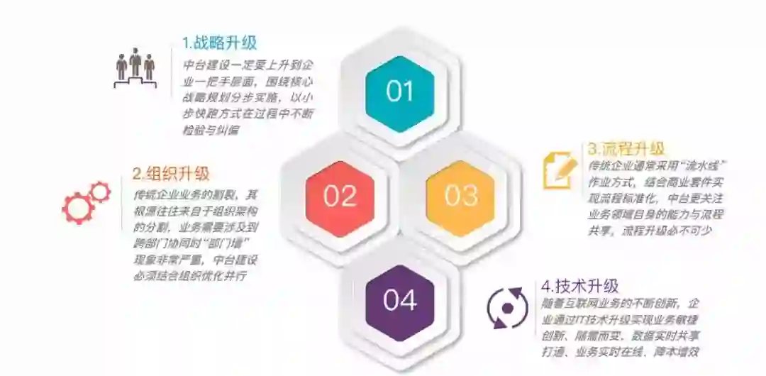 组织升级。组织架构需要与中台架构相匹配,根据企业实际情况优化组织效率。