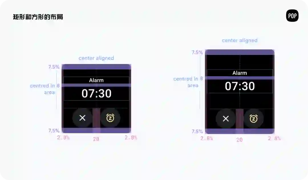 正方形(180点):通过指示元素的相对对齐并提供足够的垂直拉伸空间,矩形布局也可以用于方形屏幕,而无需单独的规范。
