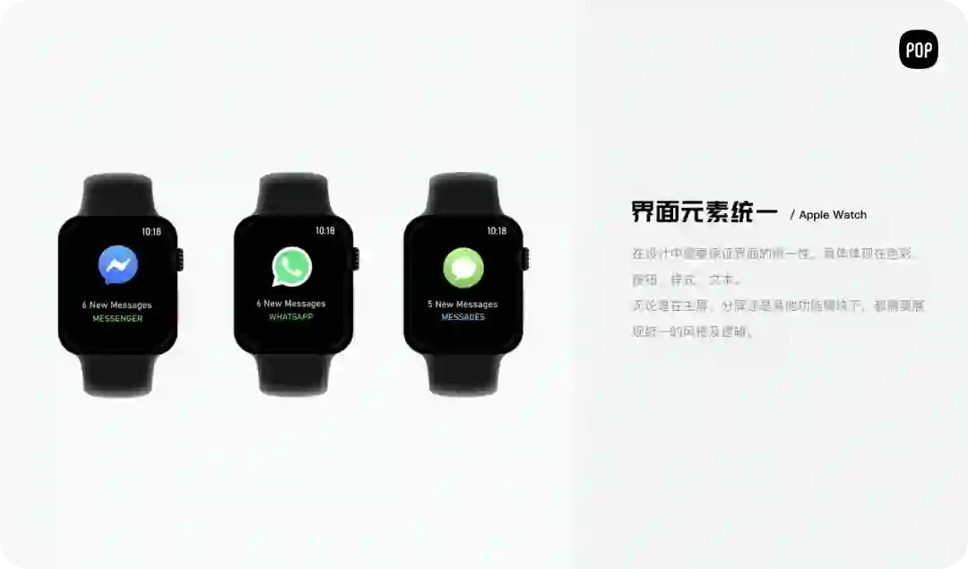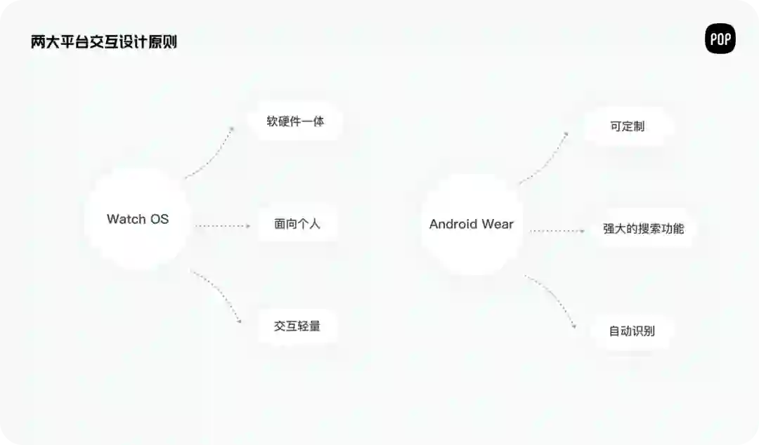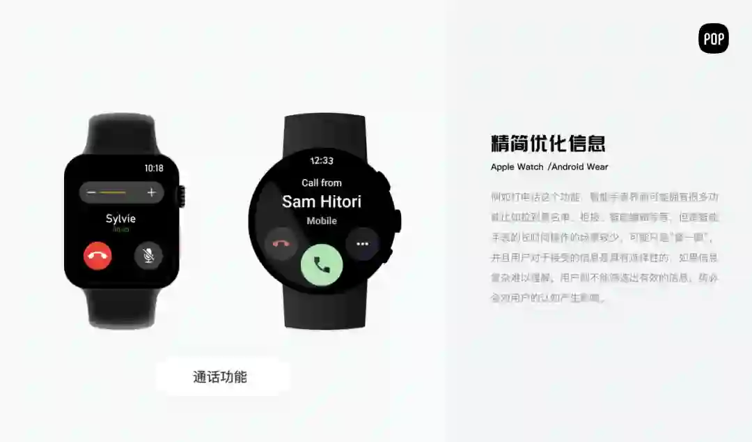 由于智能手表也采用这两大系统设计,所以其设计的出发点和原则比较相近,都是由简单的交互方式及明确的布局构成。