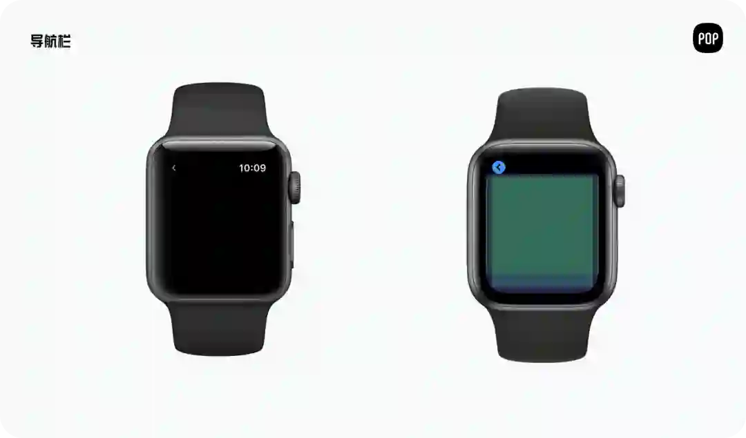 导航栏出现在 Apple Watch 屏幕的顶部边缘,并且现在每个非模态应用屏幕的导航栏中不能移除。