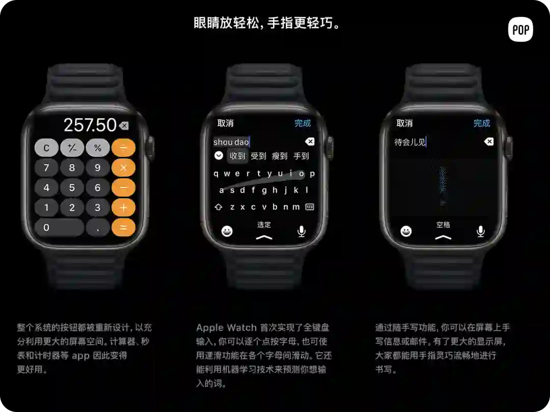 Apple Watch 上的交互操作简单快捷,不像手机、电脑等复杂的操作方式。抬起手机可以查看最新收到的信息、戴着口罩可以面部解锁、放下手腕就能熄屏。
