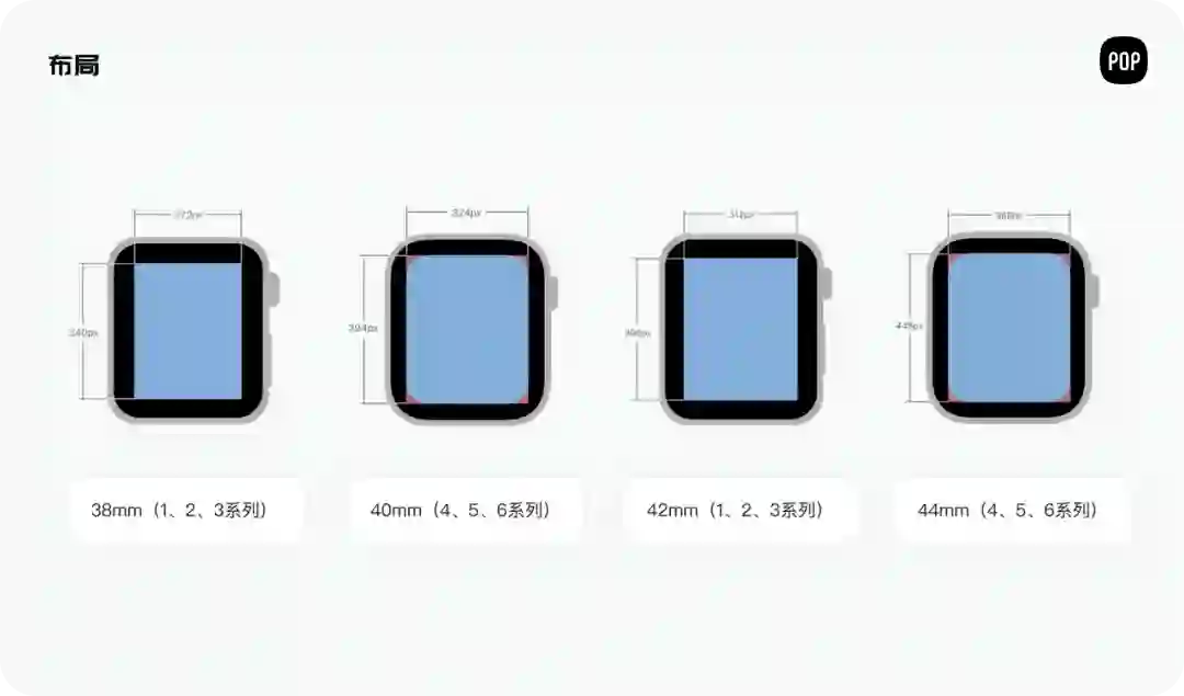 Apple Watch 有四种尺寸——38mm、40mm、42mm、44mm,其中40mm、44mm的是比较新的设备规格。小屏幕尺寸是340×272像素,大屏幕是390×312像素(核心设计尺寸)。