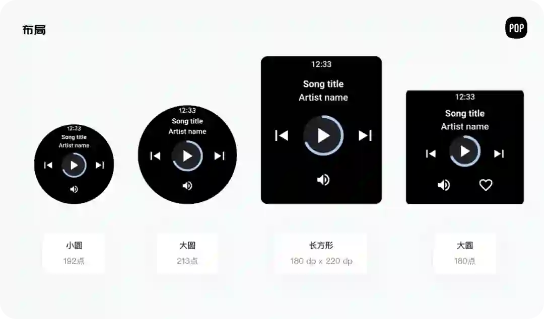 大圆(213点):对于大型圆形布局,Wear OS 可以提供对任何尺寸的替代