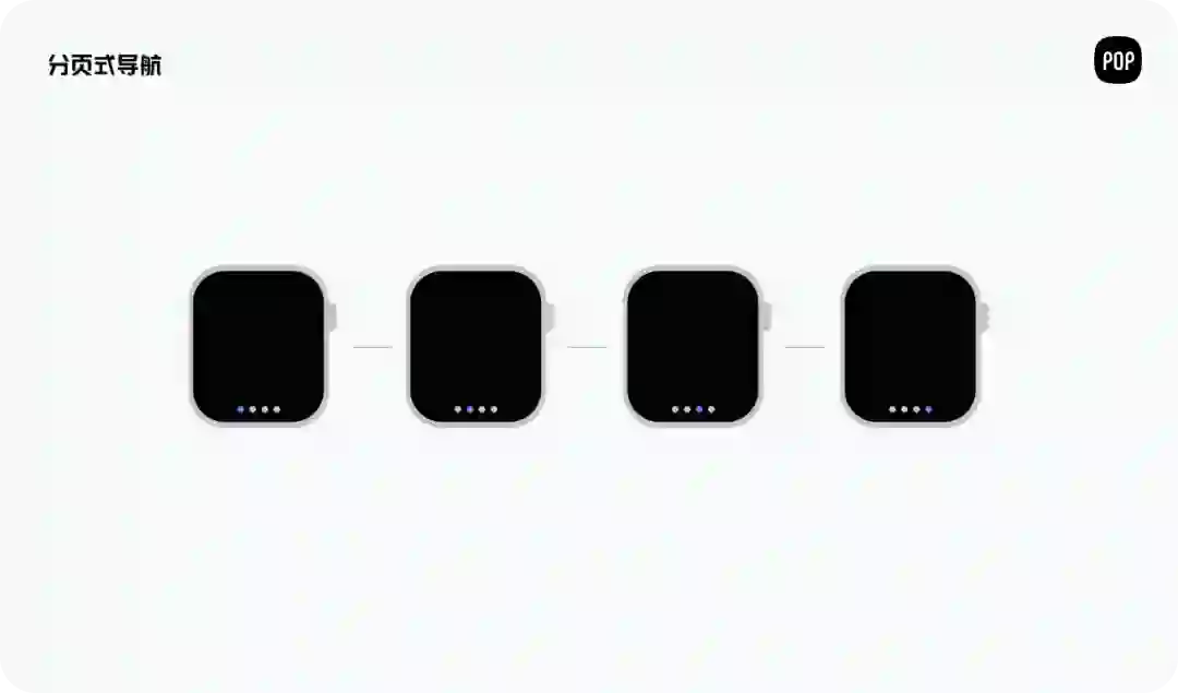 分页式主要就是将功能模块化,均衡罗列在手表上,优点是信息获取比较完整,但是缺点是不可适用于拓展性的系统(拓展性系统是指第三方软件平台的系统),因为过多的模块会导致界面冗余,信息繁杂且无序。